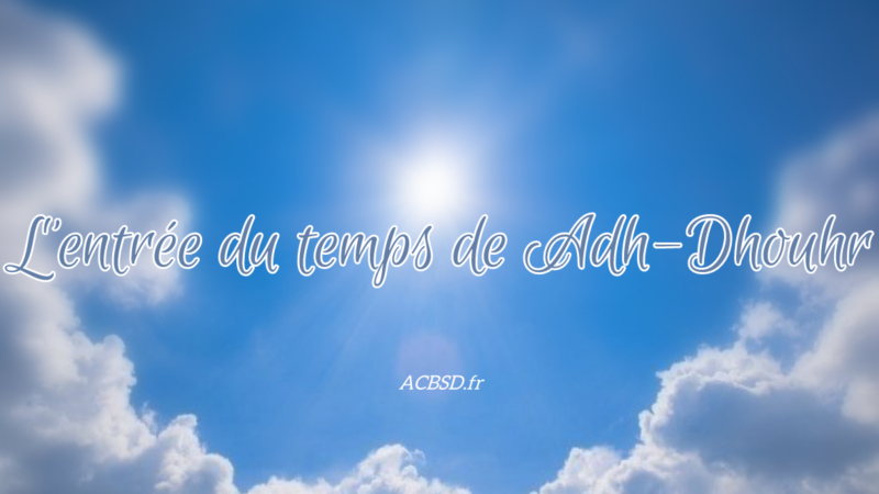 (la prière de la mi-journée de quatre rakʿah – de quatre séquences rituelles de la prière –) son temps commence lorsque le soleil s’écarte du milieu du ciel vers le couchant et finit lorsque l’ombre d’une chose quelconque atteint une longueur voir plus